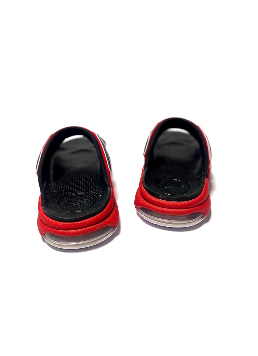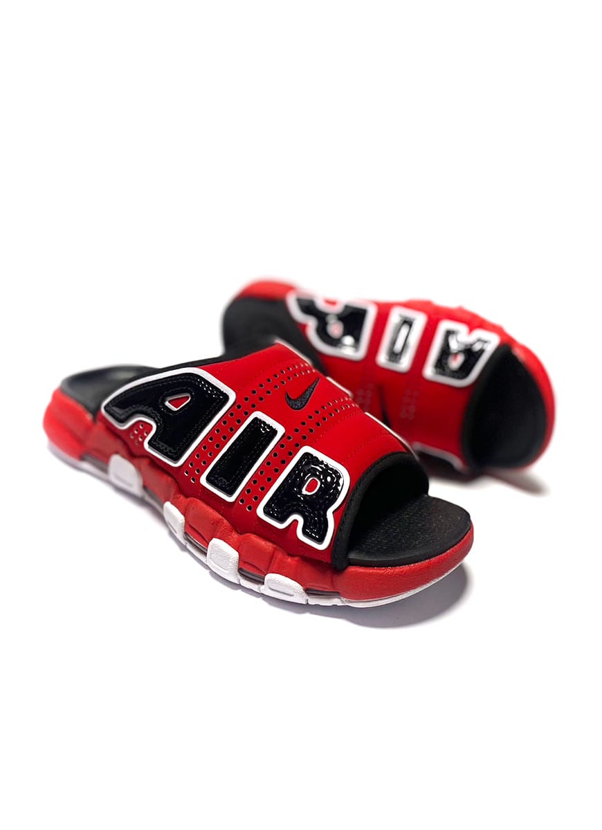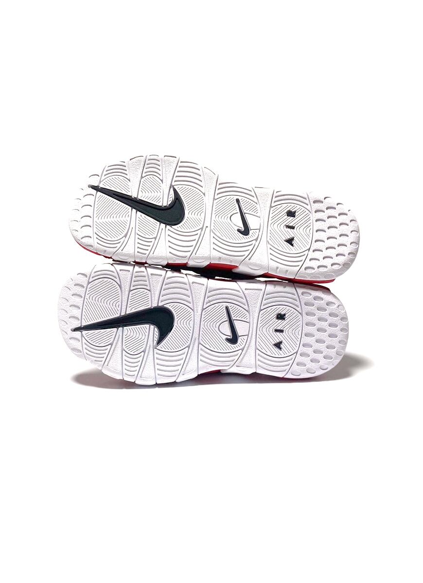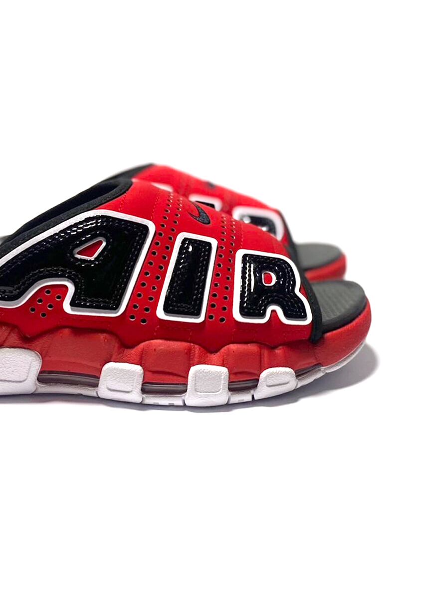 アッパーのレッド、サイドのAIRの文字はブラックのパテント、ホワイトのアウトソールに配色した Nike Air More Uptempo Slide “Bulls / Hoop Pack” に仕上げている。
